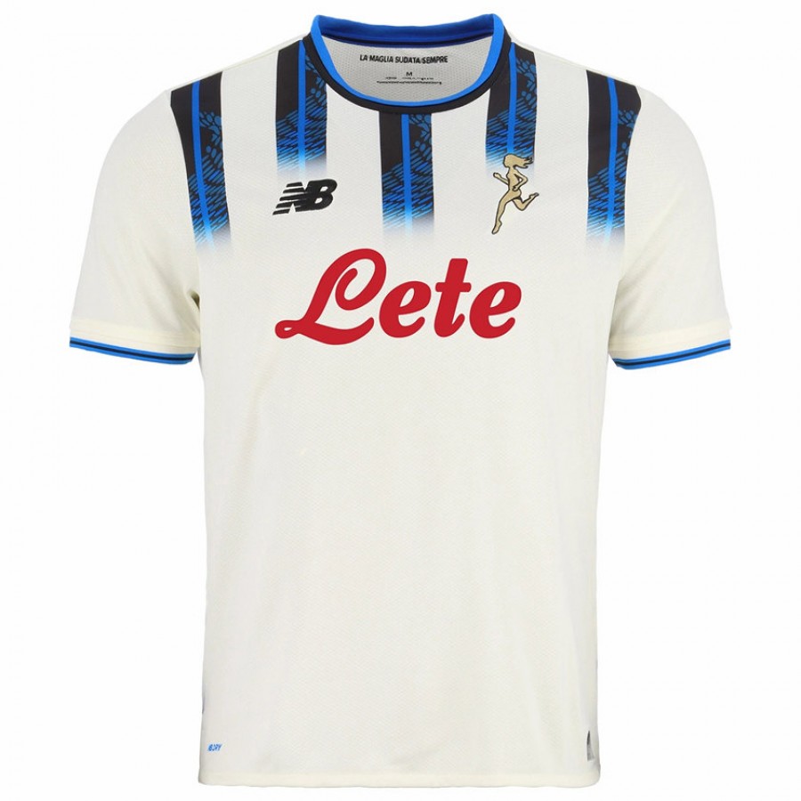 The 2025-26 Atalanta Away kit is a celebration of history and style. Incomplete vertical stripes emanate from the top front and lower back, before fading into the predominantly off-white body of the shirt. This unique design is a contemporary interpretation of the colorful geometric patterns favored on the kits of the late '80s and early '90s. The badge draws on an earlier era of Atalantas history. The gold silhouette of la dea in stride is taken from the club crest introduced in 1963.