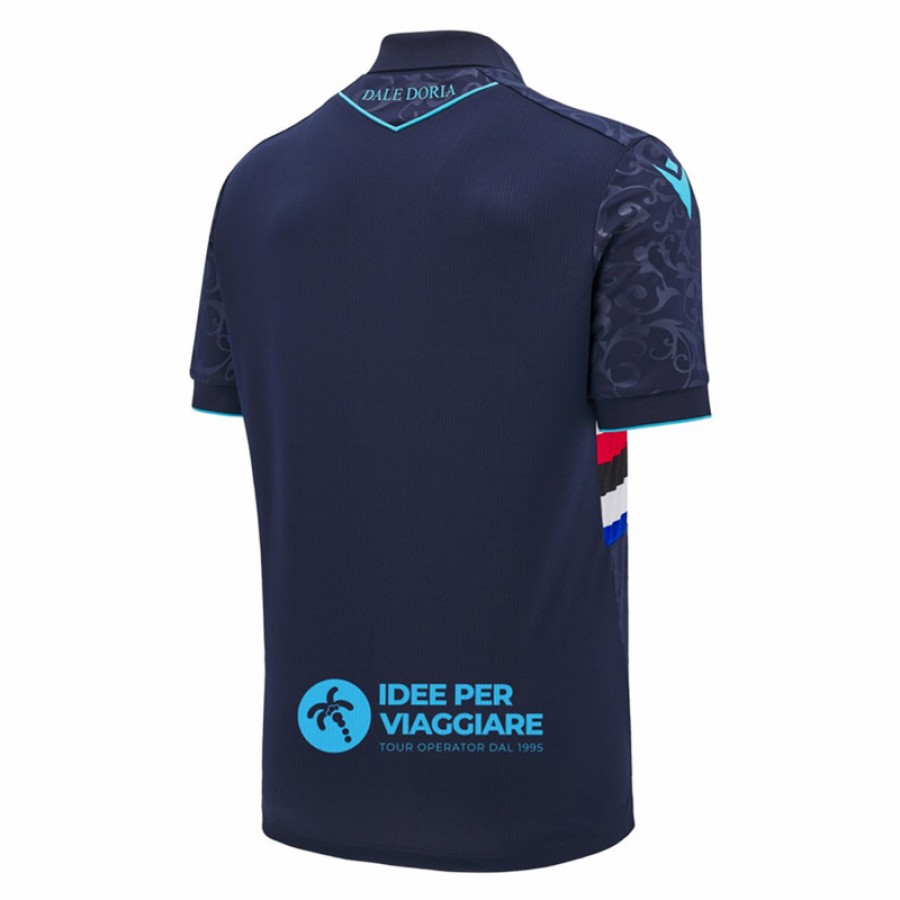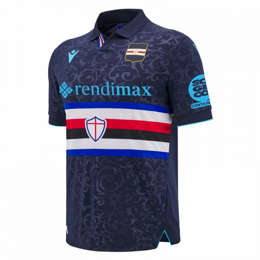The 2024/2025 Third Match Shirt combines tradition and elegance, featuring a dark blue background embellished with an embossed pattern and the traditional Blucerchiata band.