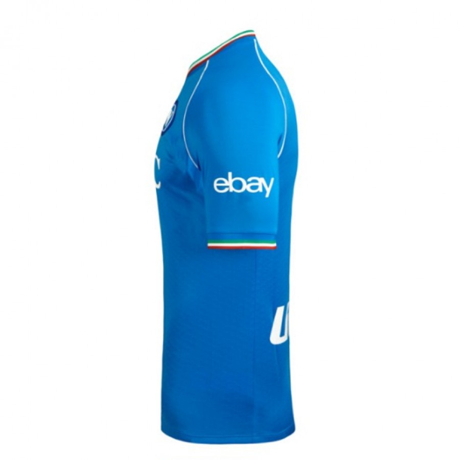 Manica raglan, piping bianco, scollo a V con tricolore anche sul bordo manica. Nuovi loghi Napoli all-over tono su tono. Tecnologia Dry Touch. Scudetto applicato sul petto. Vestibilità slim. Composizione: 82% poliestere, 18% elastan.