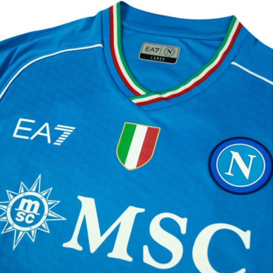 Maglia gara home azzurra replica SSC Napoli 2023. La maglia gara EA7/SSC Napoli rappresenta l'unicità e la nuova era degli Azzurri nel mondo.