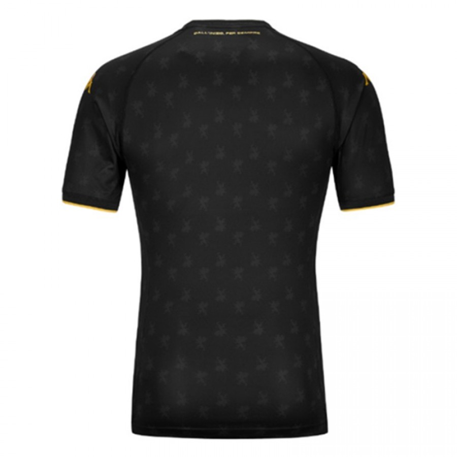 La terza maglia Kappa del Genoa C.F.C. 2024-2025 è prevalentemente nera con dettagli dorati. Il colletto a V, i polsini, il logo Kappa e lo stemma del Genoa sono tutti dorati, creando un look misterioso e lussuoso.