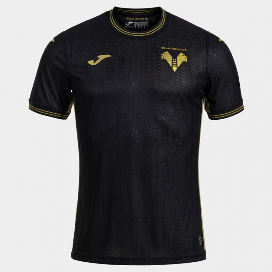 Lo stemma dell'Hellas Verona FC è stato realizzato in silicone sul davanti per dare un tocco moderno alla maglia, con due scritte che riportano la scritta "HELLAS VERONA FC" stampata. Sulla parte superiore del retro, è presente un'altra piccola stampa con la scritta "FONDAZIONE HELLAS VERONA", in omaggio alla loro organizzazione benefica che sostiene i giovani in condizioni di sofferenza.