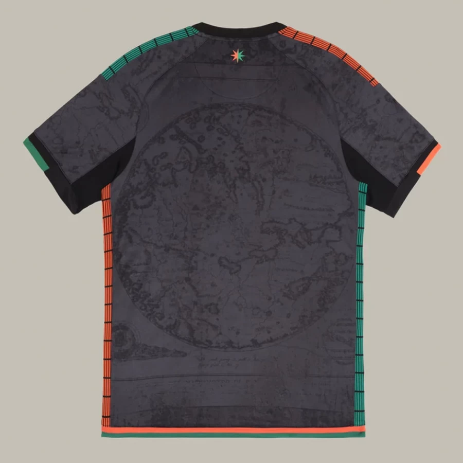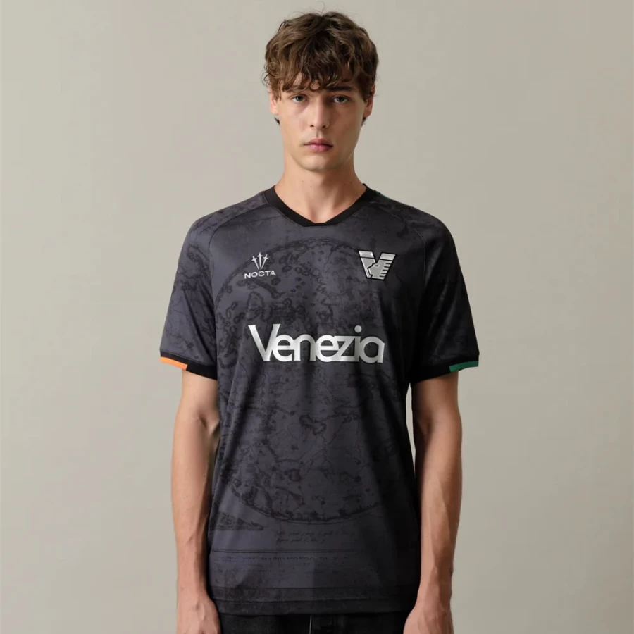 Ispirandosi allo spirito della cartografia del XV secolo, la maglia Home 25/26 fonde tradizione e innovazione. La sua base completamente nera è impreziosita dalla scritta "Venezia" argentata sul petto, con i loghi NOCTA e Venezia FC posizionati in perfetta simmetria. I vivaci pannelli laterali arancioni e verdi celebrano l'identità del Club con un contrasto sorprendente e carattere.