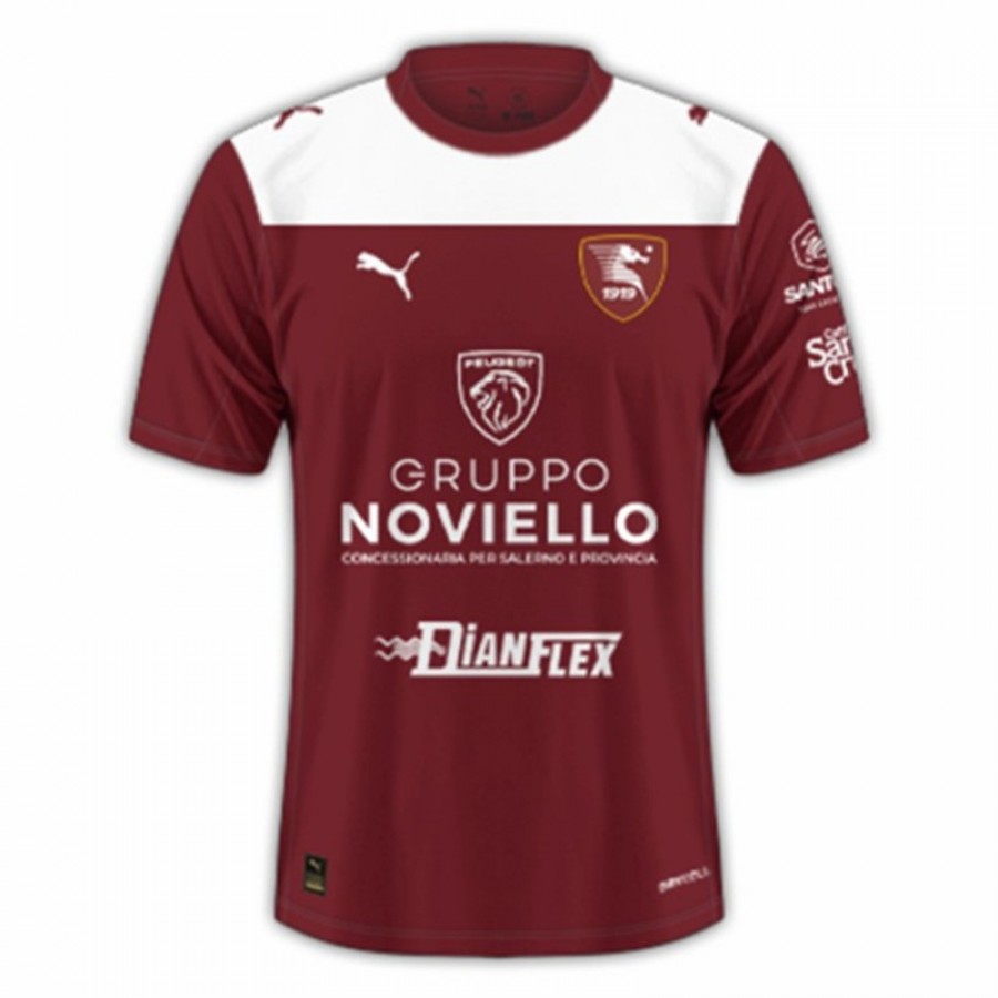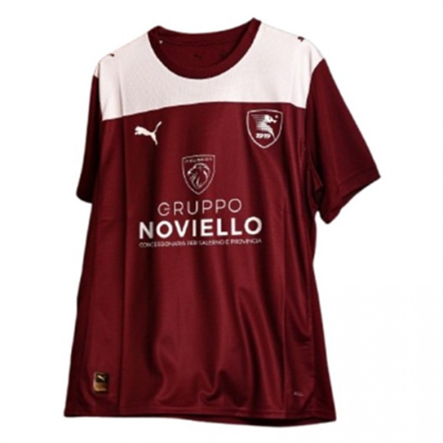 La maglia casalinga della Salernitana per la stagione 2025-26, firmata Puma, presenta una base bordeaux. Il design include un pannello bianco che attraversa le spalle e la parte superiore del petto, con un colletto bianco a girocollo. Diversi sponsor sono visibili sul fronte e sulle maniche.